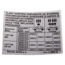 Štítek pro tlak v pneumatikách Štítek s hodnotami pro předepsaný tlak v pneumatikách.