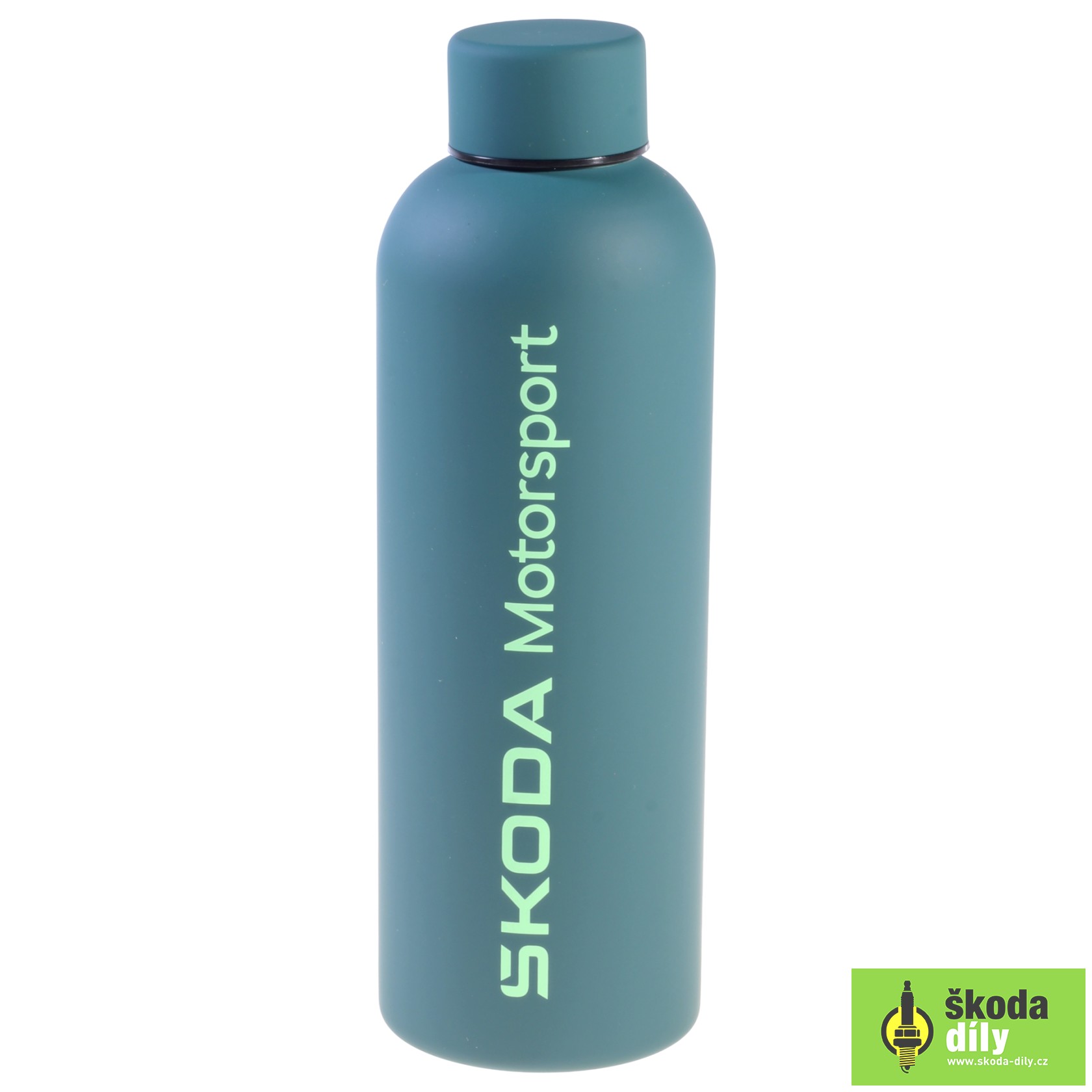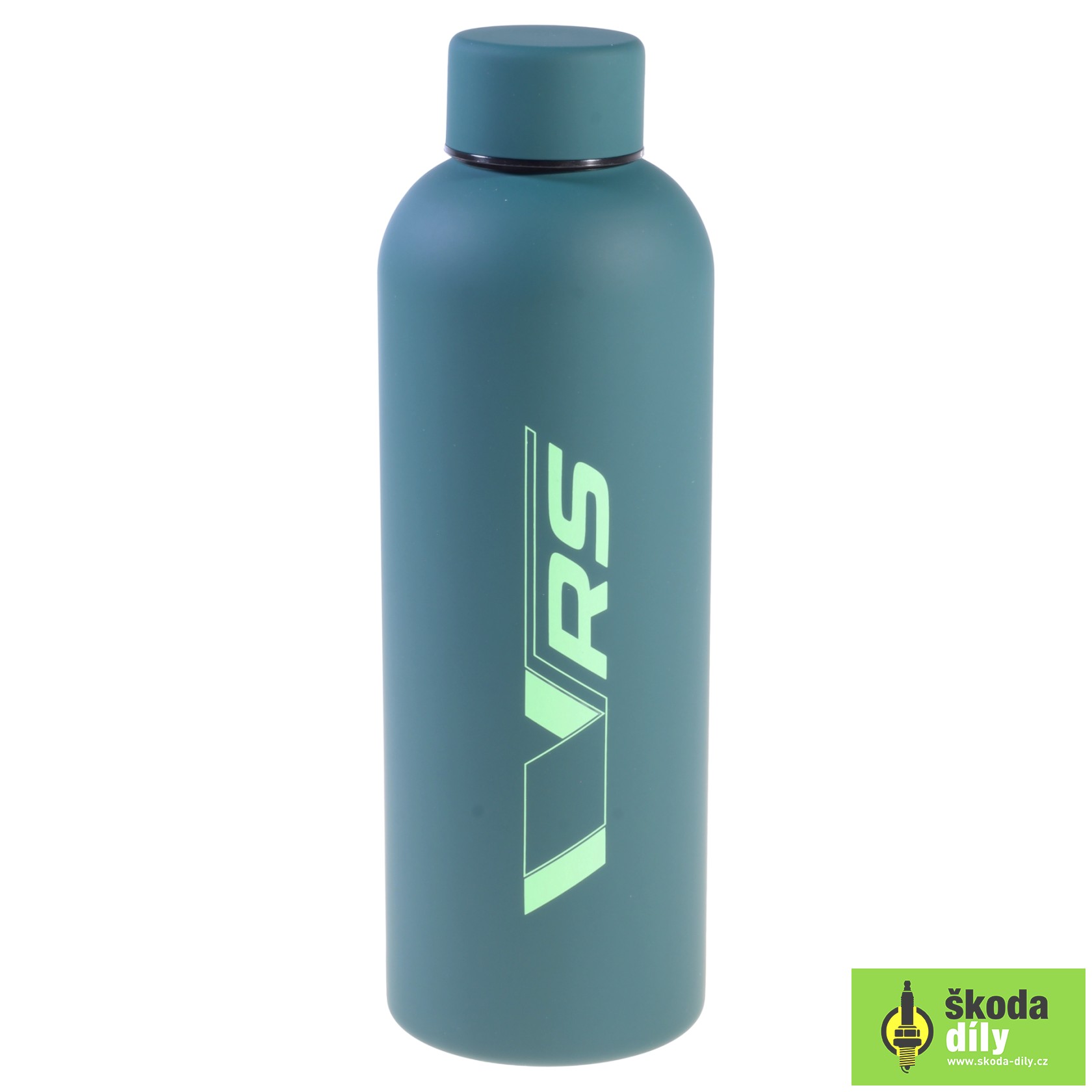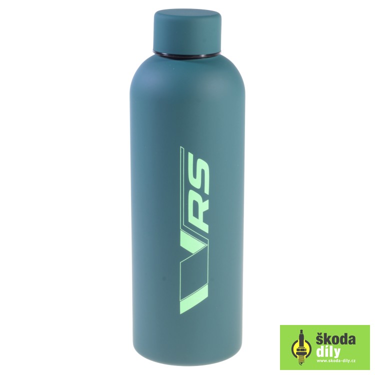 Termolahev v barvě emerald green s nápisem "ŠKODA Motorsport" na jedné straně a "VRS" na druhé straně.