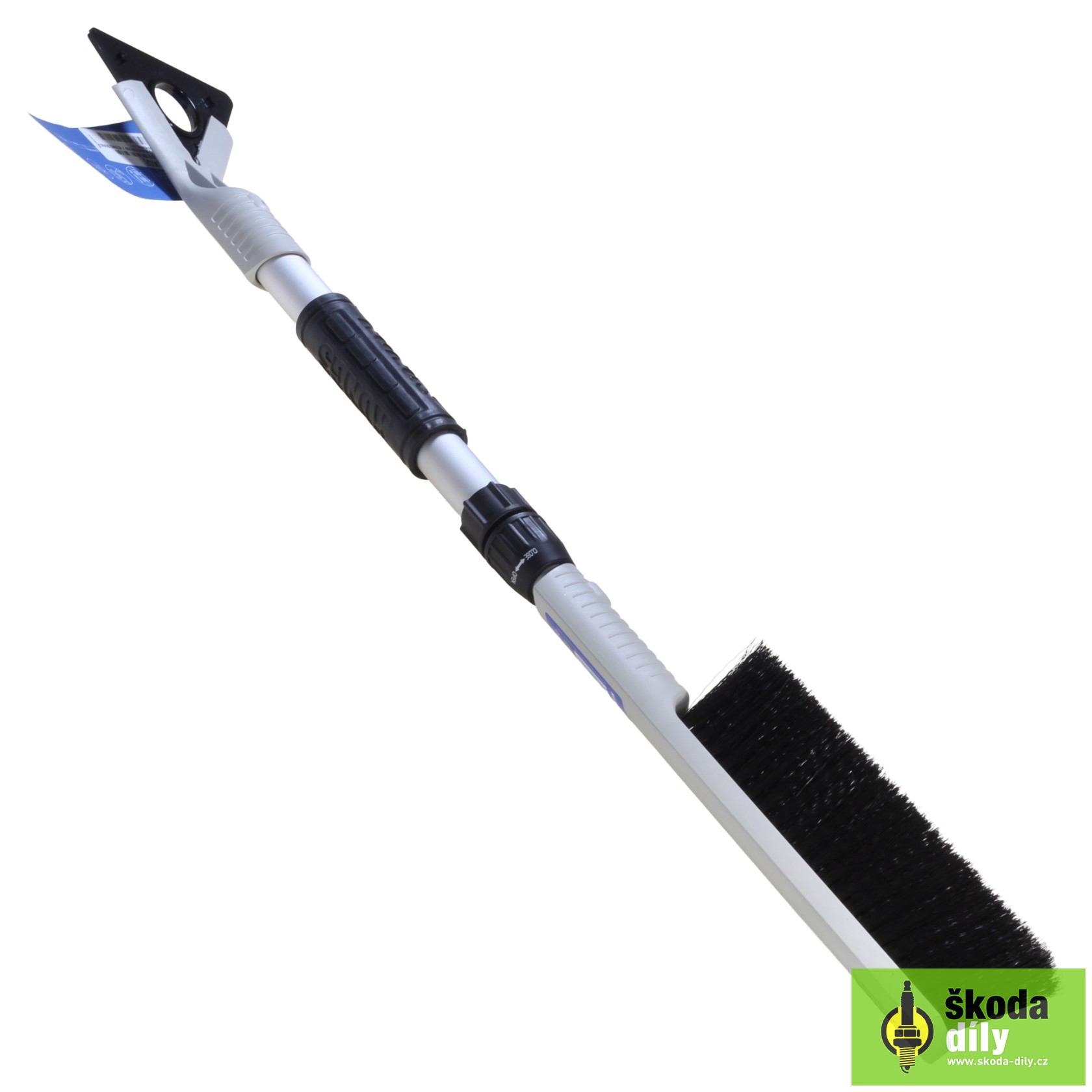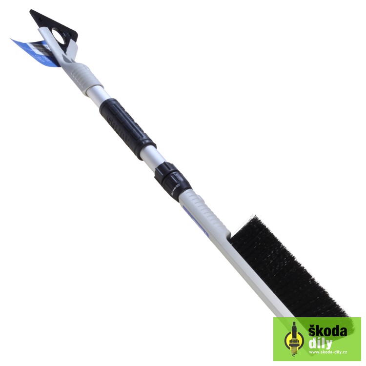 Teleskopická škrabka se smetáčkem pro odstranění námrazy a sněhu z automobilu. Břit lze použít ze všech tří stran což prodlužuje životnost, v jednom rohu břitu je výřez pro očištění gumiček stěračů.